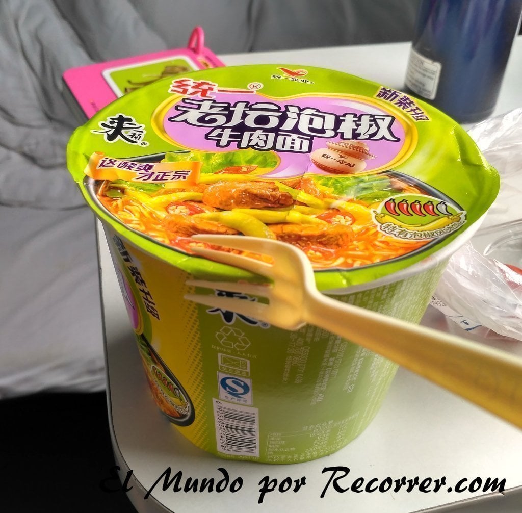 China no es un país pequeño, y los trenes son lentos y tediosos. Los trayectos en tren pueden durar días. Los trenes van equipados con vagones cama, pero ¿qué comen los chinos? Sí, se alimentan a base de noodle, una especie de espaguetis instantáneos, y todo tipo de snacks.